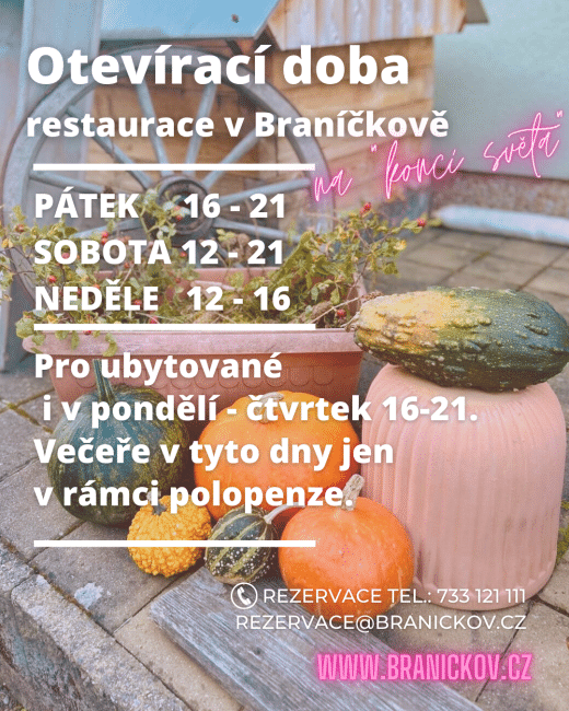 Aktuální podzimní otevírací dobu restaurace v Braníčkově